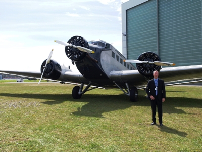 The RIMOWA Junkers JU 52 tri-motor, with EAA's Jeff Kaufman, after the April 19 announcement in Germany that AirVenture would be included on the airplane's North American tour. (photo by Marino Boric)