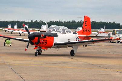 The mighty Turbo Mentor blazed its last trail at Naval Air Station Whiting Field, Thursday, April 19 with the last training flight at the air station. Cmdr. John Hensel and 1st Lt. Sarah Horn completed the final training flight at noon with a celebration waiting for them. A new fleet of the T-6B Texan II is replacing the Navy's classic trainer at Whiting.