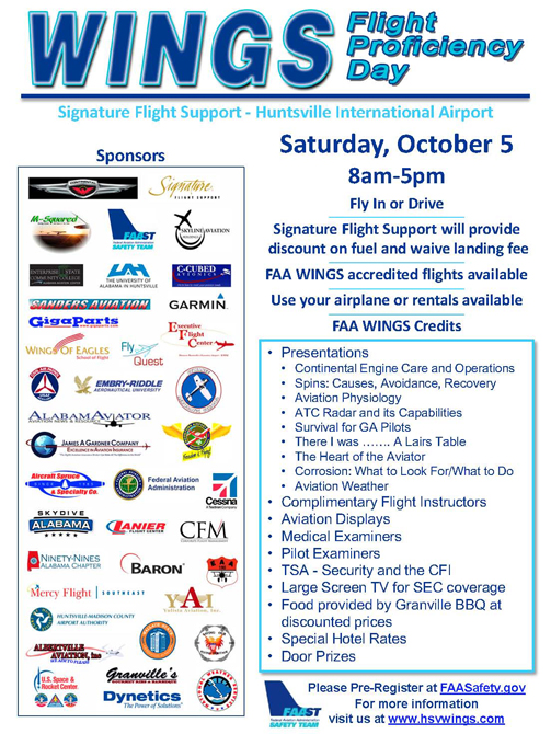 HUNTSVILLE AL - This year's WINGS Pilot Proficiency Day at the Huntsville Airport is Saturday October 5th. A tremendous list of participants this year and a broad variety of activities will keep you engaged for a full day of learning and fun.